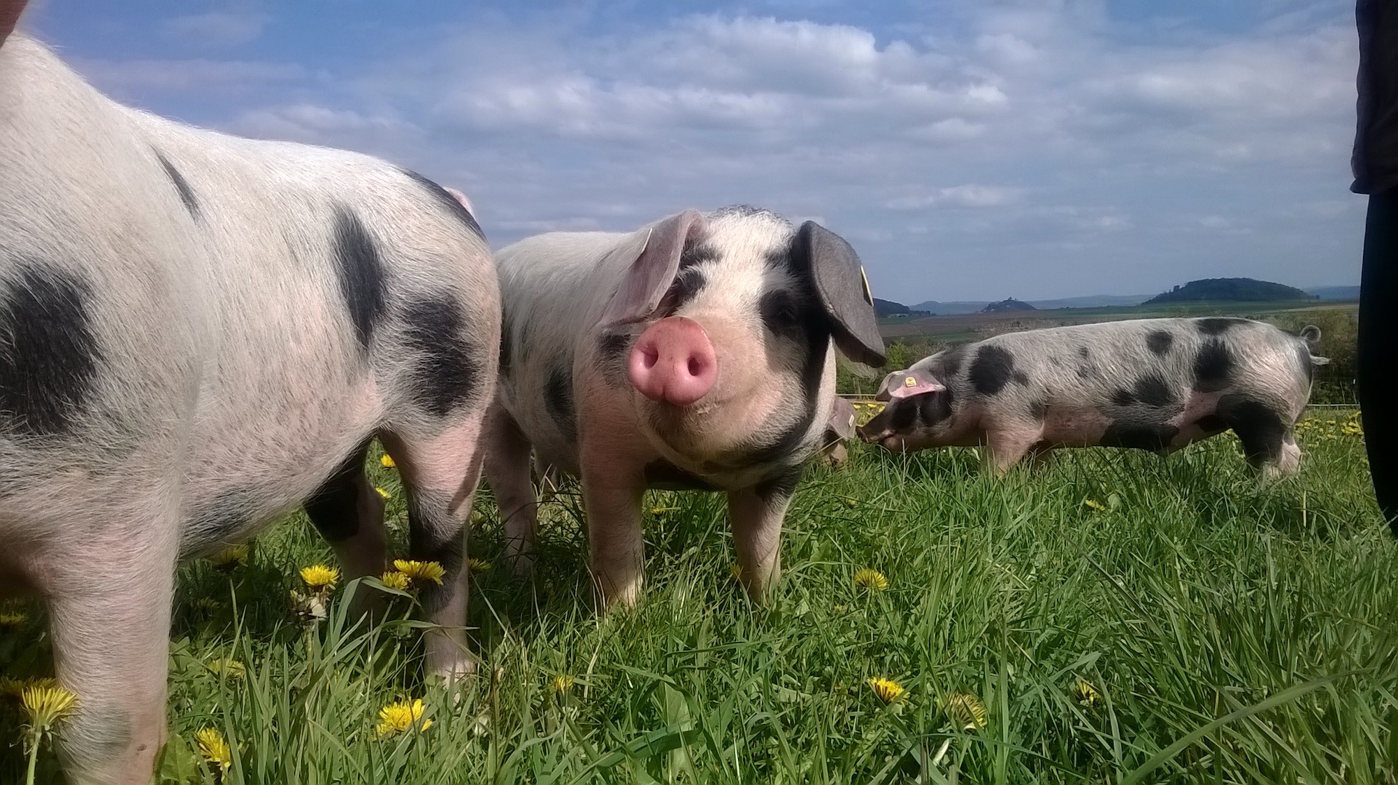 Ich halte eine Herde Galloway-Fleischrinder in Freilandhaltung, mehrere Gruppen Mastschweine der Rassen Bunte Bentheimer x Pietrain und Schwäbisch-Hällische x Duroc, sowie zwei Gruppen Legehennen mit ca. 160 Tieren.